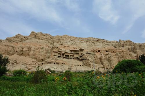 坐落于新疆拜城县的悬崖峭壁之上的克孜尔石窟。
