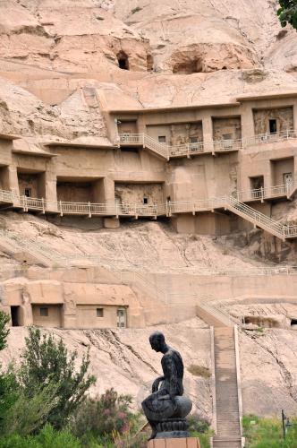 鸠摩罗什铜像矗立在克孜尔石窟前。鸠摩罗什是中国四大佛经翻译家之一。