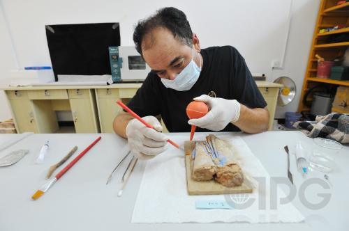 新疆龟兹研究院的工作人员在对雕塑残件进行清理修复。