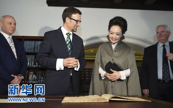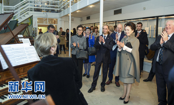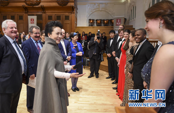 彭丽媛抵达时,受到皇家音乐学院董事会主席温斯顿勋爵、学院院长、英国友人等热烈欢迎。在院长陪同下,彭丽媛欣赏了获奖学生和校友精彩的声乐、器乐表演,参观了乐器博物馆,观赏了图书馆珍藏的莫扎特、肖邦等音乐大师创作手稿,并同学院师生进行交流。彭丽媛表示,音乐作为一种高尚的艺术形式,超越国家、民族、历史、文化界限。皇家音乐学院培养出众多世界级艺术家。中国有不少音乐作品享誉世界,希望皇家音乐学院今后加强同中国音乐院校的交流,为促进中英教育和艺术合作贡献力量。