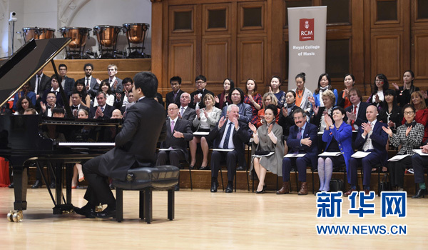 10月22日,国家主席习近平夫人彭丽媛在伦敦参观皇家音乐学院。这是彭丽媛观看该校学生的表演。 新华社记者 谢环驰 摄