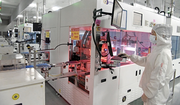 2025年5月20日,安徽省淮南市凤台经济开发区,中环低碳(安徽)新能源光伏科技有限公司工人生产新型光伏电池片