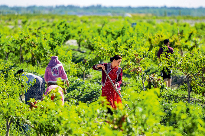 2020年6月19日,新疆克孜勒苏柯尔克孜自治州阿克陶县皮拉勒乡依也勒干村,村民在戈壁滩中新建的林果基地为桃树打枝并给林间套种的西瓜进行田间管理