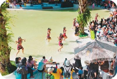 游客在西双版纳热带花卉园欣赏民族特色表演。