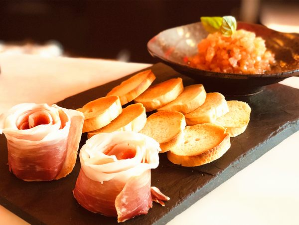 本次卡本妮法餐厅推出的西班牙伊比利亚火腿系列菜单,颇有新意:由西红柿和西班牙初榨橄榄油制作的Salas酱抹在刚刚出炉的面包片上,配上薄薄的火腿片,肉香和果蔬的清香混合着面包的麦香,非常开胃。冷吃的小番茄、水牛芝士串和蜜瓜火腿串甜咸口味搭配火腿,配餐前饮用的葡萄酒非常合适。热吃的“西班牙黑猪火腿芝士卷配番茄汁”,嫩滑的芝士与火腿片互相包裹融入奶香浓郁。