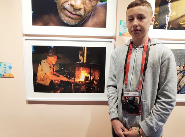 奥地利男孩萨巴斯蒂安·波罗斯用相机全程记录着仪式的每个精彩瞬间,并站在自己的获奖作品《淳炼》前留影纪念