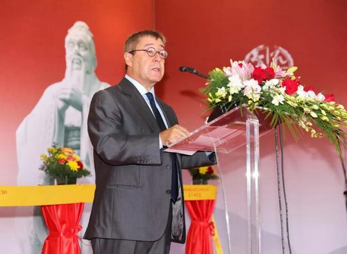 ▲ 中国外文局副局长陆彩荣主持“孔子的智慧”文化展开幕式。