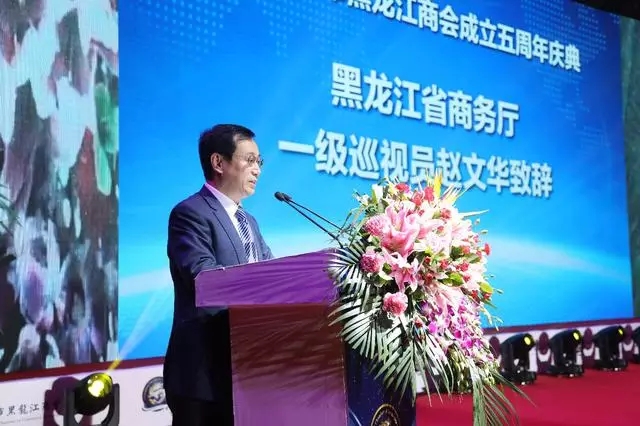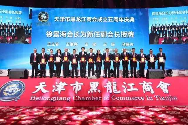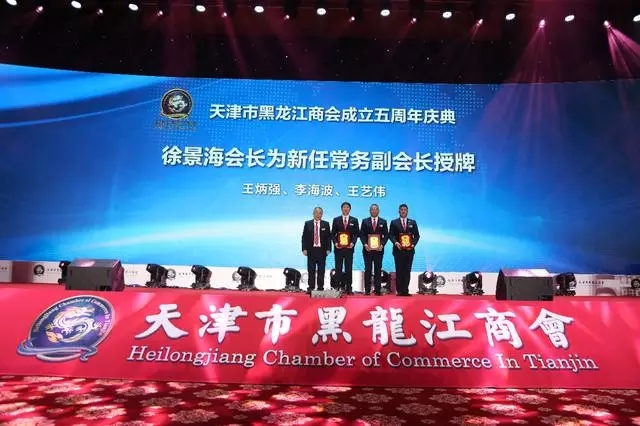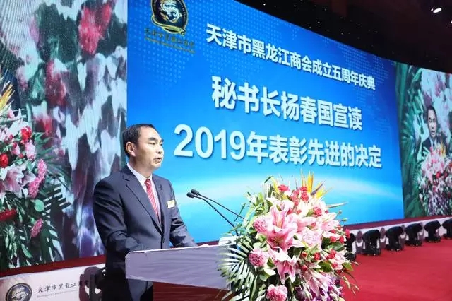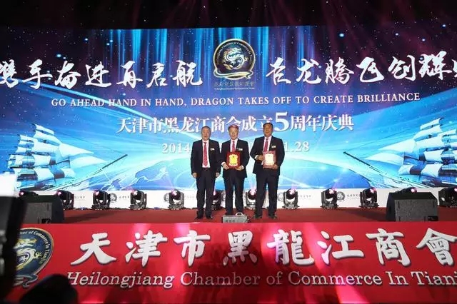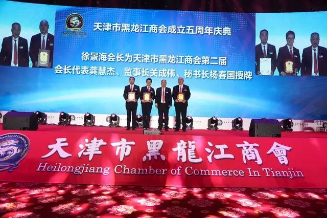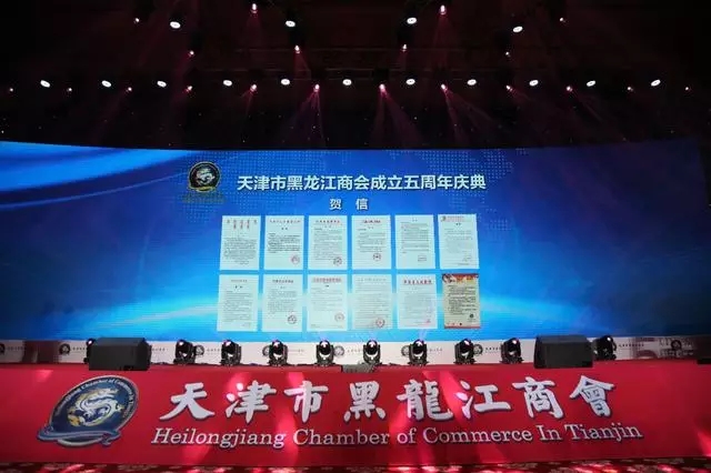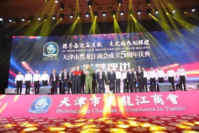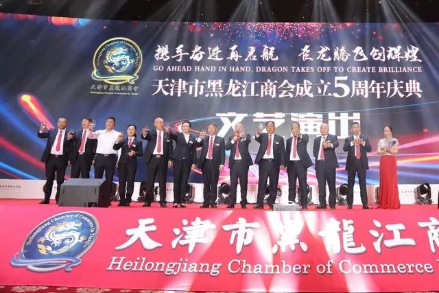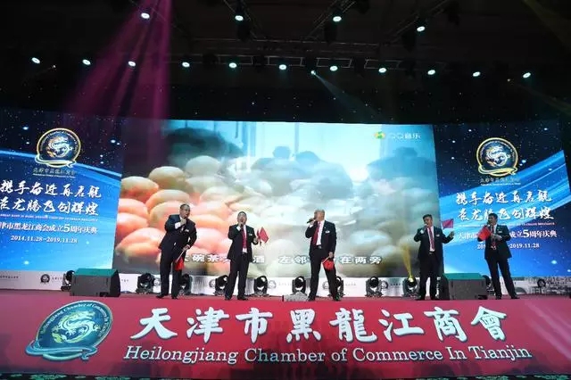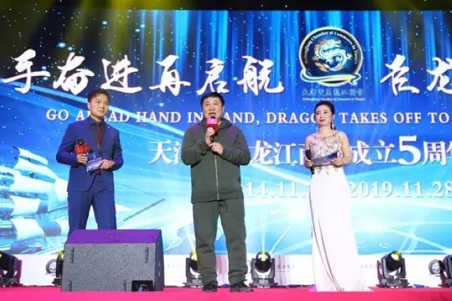 龙商联盟主席田在玮、天津市工商联娄杰副主席、黑龙江工商联专职副主席沙育超、黑龙江省商务厅一级巡视员赵文华先后登台致辞,表达了天津、黑龙江两地政府和龙商联盟对天津市黑龙江商会未来发展的殷切期望。同时,特邀嘉宾演员刘流也代表同乡上台向天津龙商成立五周年送来祝福。