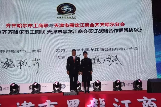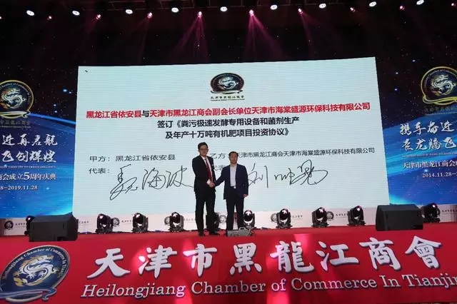 举行签约仪式,助力两地经济发展,推动政企平台合作。天津市黑龙江商会徐景海会长与天津宁河现代产业园区党工委书记、管委会主任刘剑铭签订《关于设立天津市黑龙江商会宁河现代产业区企业家创业基地战略合作协议》,天津市黑龙江商会常务副会长、齐齐哈尔分会会长王炳强与齐齐哈尔市工商联主席魏艳芹签订《齐齐哈尔市工商联与天津市黑龙江商会战略合作框架协议》,天津市黑龙江商会副会长、天津市海棠盛源环保科技有限公司总经理刘帅男与黑龙江省依安县县长魏海波签订《粪污极速发酵专用设备和菌剂生产及年产十万吨有机肥项目投资协议》。