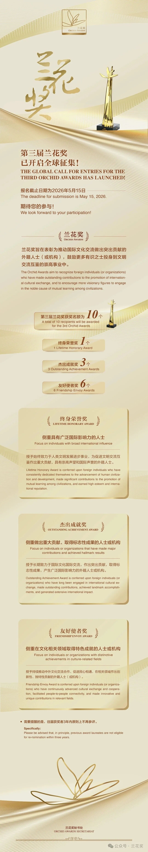 The global call for entries for the 3rd Orchid Awards has launched. The deadline for submission is May 15, 2026. Please follow the Orchid Awards official WeChat account for the announcement and submit your application information on time. We look forward to your participation! 那么,兰花奖的奖项设置是怎样的?具体评选表彰什么?下图为您解答。 What are the award categories of the Orchid Awards? Who and what do the Orchid Awards recognize and honor? Please check the details below.