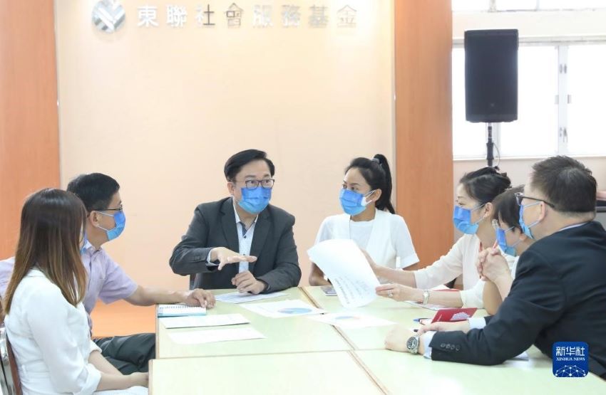 热线发起人之一、东联社会服务基金会长李志峰(左三)在主持会议,部署“抗逆心聆热线”团队下一步的工作(4月29日摄)。 新华社记者 吴晓初 摄