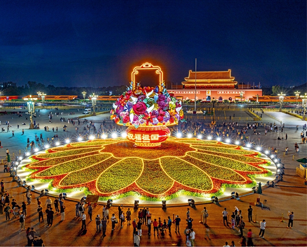北京天安门广场展出“祝福祖国”巨型花篮,主景顶高18米,首次应用北京市花月季作为焦点花,并布置了会发光的鸽子造型。广场两侧绿地还布置了吉祥如意花带,18个花球点缀其中,总面积达9600平方米。在重庆渝中区及山西太原的主要街道两旁,整齐悬挂的国旗成为亮眼风景。江苏苏州、无锡、扬州等地也布置了国旗和花卉,不仅为城市增添了浓厚的节日氛围,更点燃了市民心中炽热的爱国情怀。