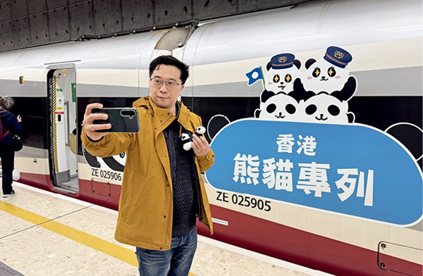 3.2025年1月11日,由港铁公司联合香港旅游发展局推出的高铁“香港熊猫专列”正式上线运营。图为乘客在大熊猫主题列车前自拍留念
