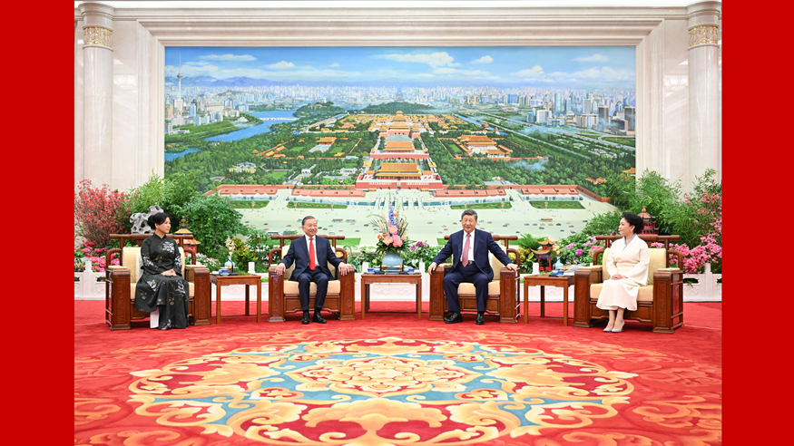 4月15日上午,中共中央总书记、国家主席习近平在北京人民大会堂同来华进行国事访问的越共中央总书记、国家主席苏林共同会见参加“红色研学之旅”的中越青年代表。
