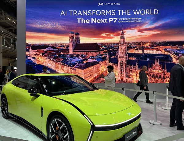 当地时间9月8日,2025年德国慕尼黑国际车展举行媒体日。此次车展将于9日正式开幕,中国展商纷纷携创新成果亮相。图为全新小鹏P7欧洲首秀