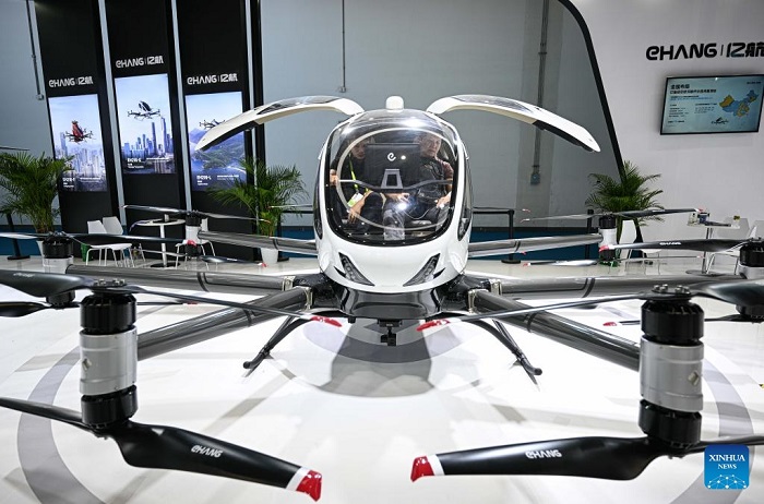 Besucher probieren ein eVTOL auf der 5. China International Consumer Products Expo in Haikou aus. (15. April 2025, Xinhua)